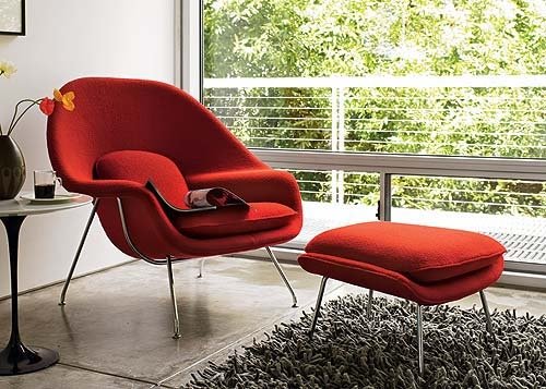 • Cadeira vermelha com puff num quarto branco e tapete cinzento
