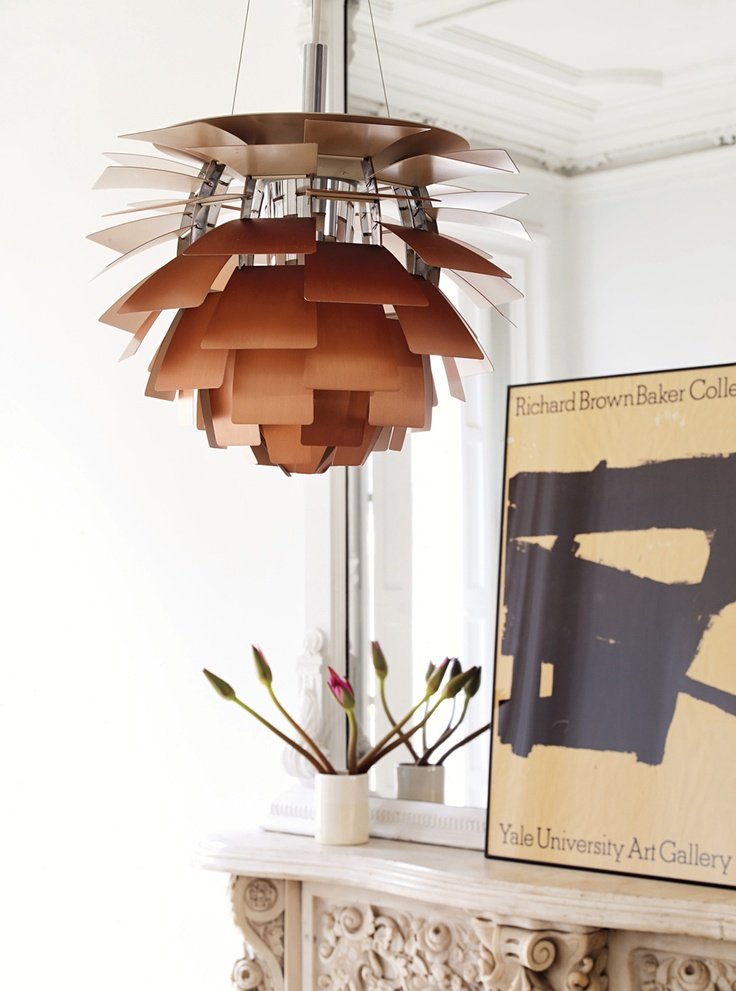 • Lâmpada pendente em metal cobre em sala com lareira e quadro decorativo