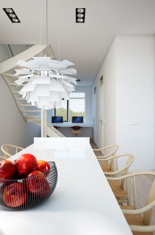 Lustre suspenso branco moderno sobre mesa de jantar branca com cadeiras em espaço interior minimalista