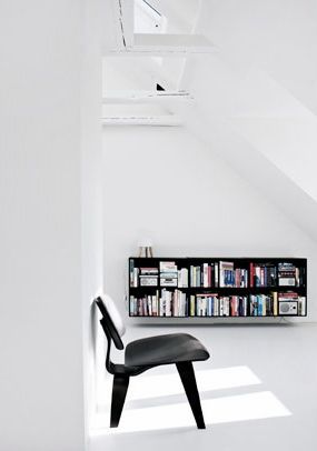 • Cadeira preta numa sala branca com estante de livros fixada na parede
