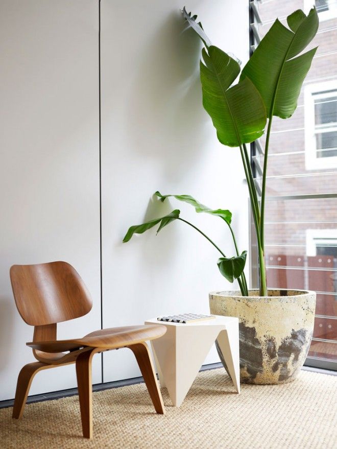 Cadeira de madeira com mesa branca e planta em vaso em interior claro.
