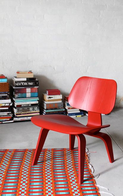 • Cadeira vermelha em madeira sobre tapete colorido, com pilhas de livros ao fundo
