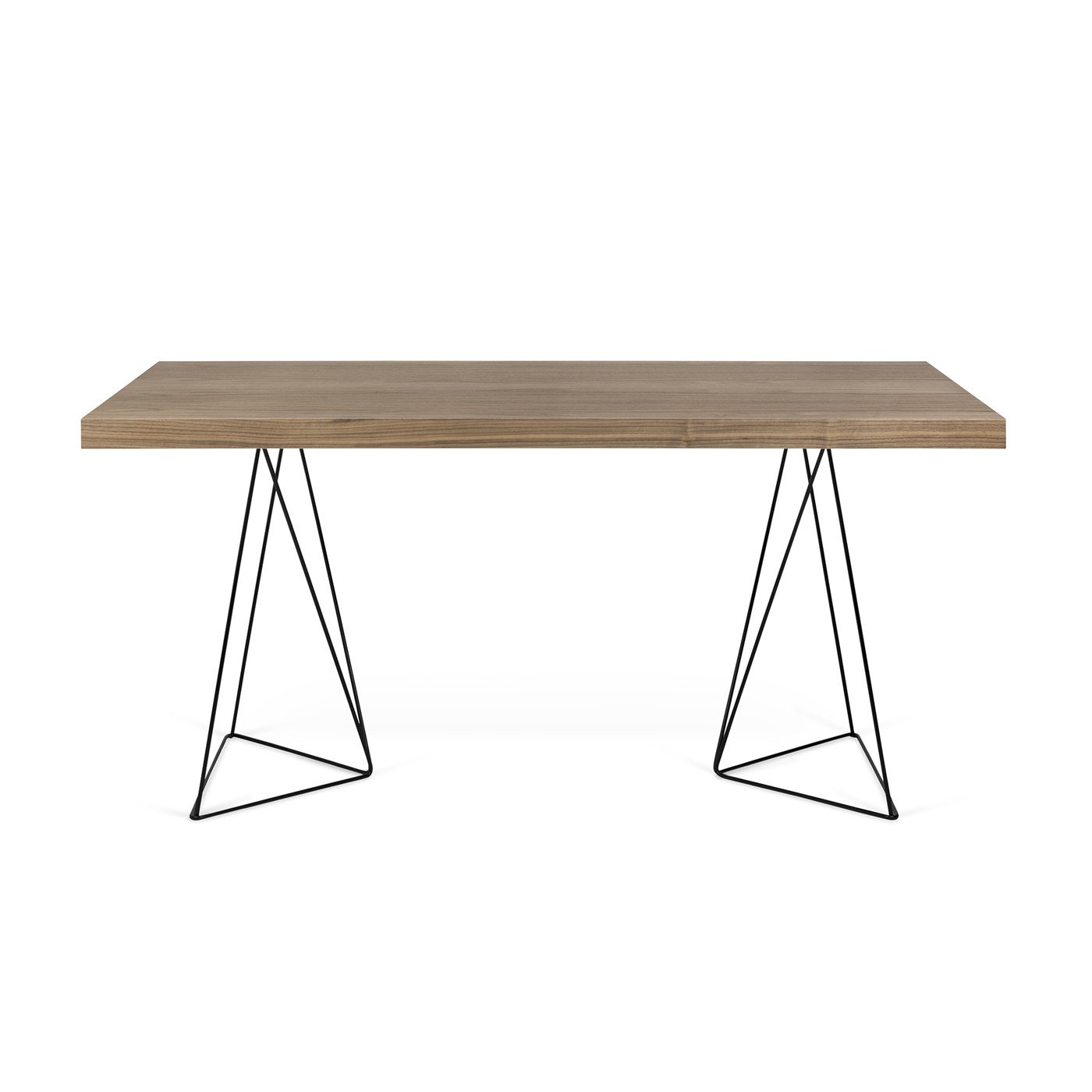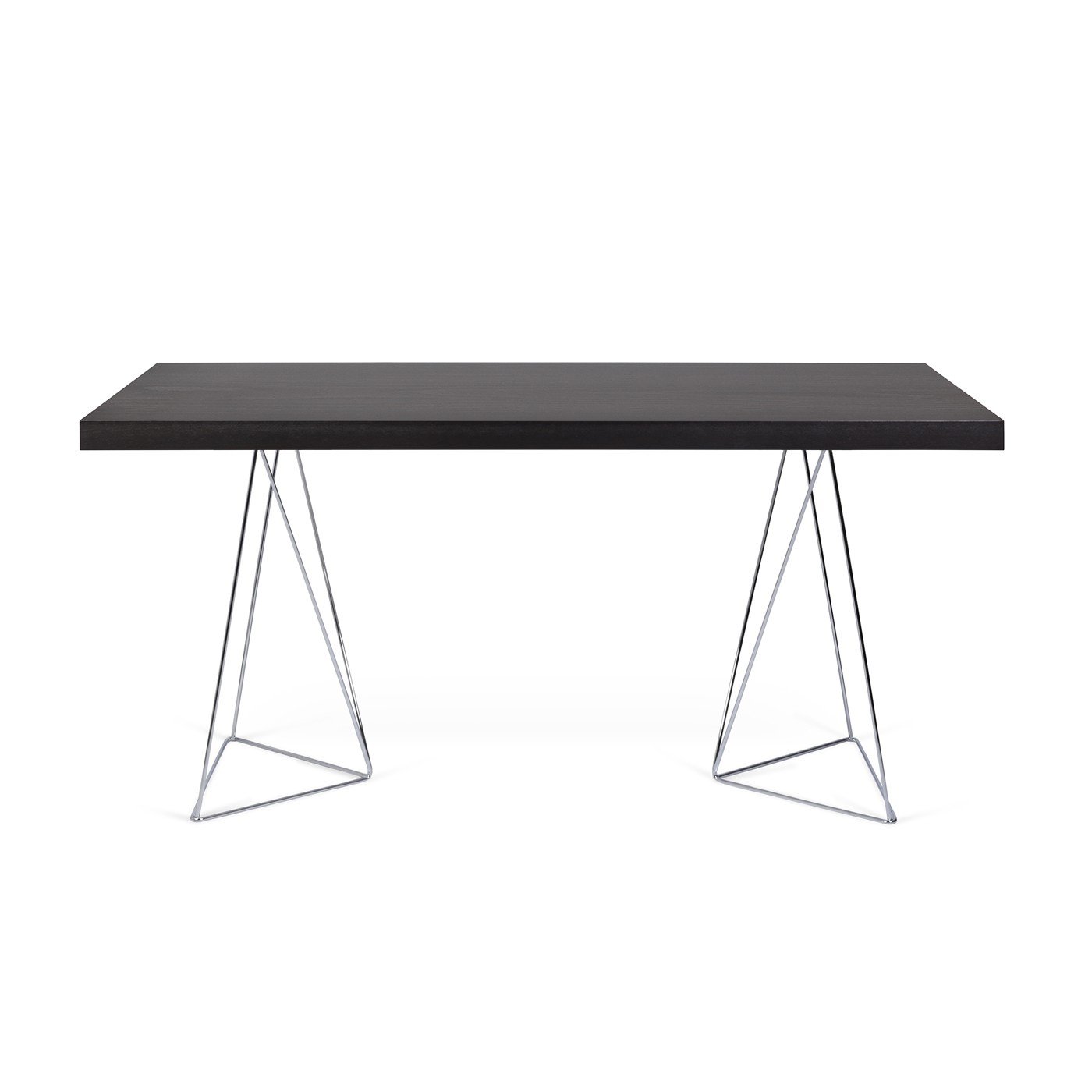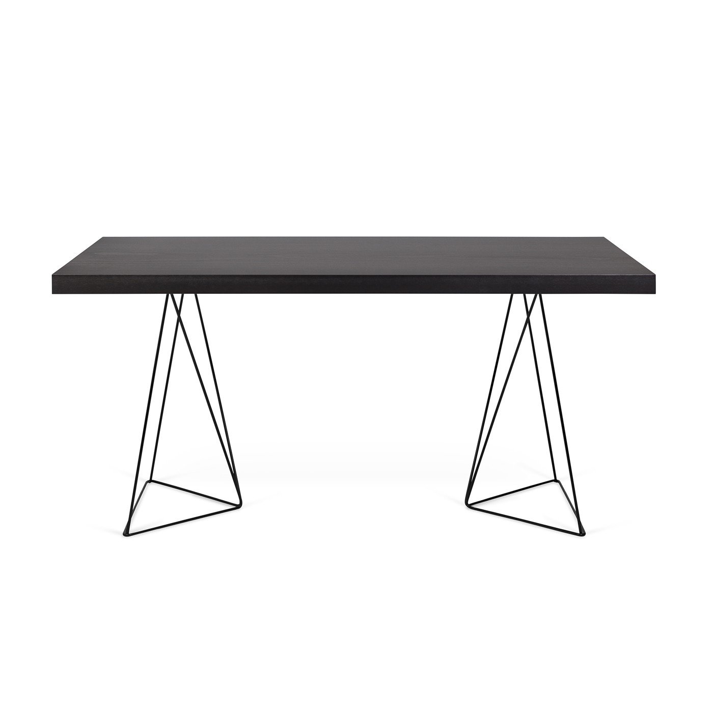 • Mesa com tampo escuro e pés triangulares metálicos
