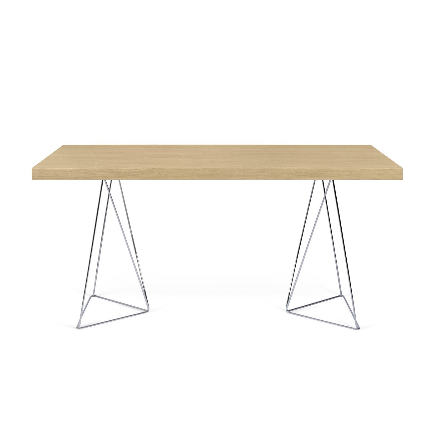 • Mesa retangular de madeira clara com pernas metálicas triangulares