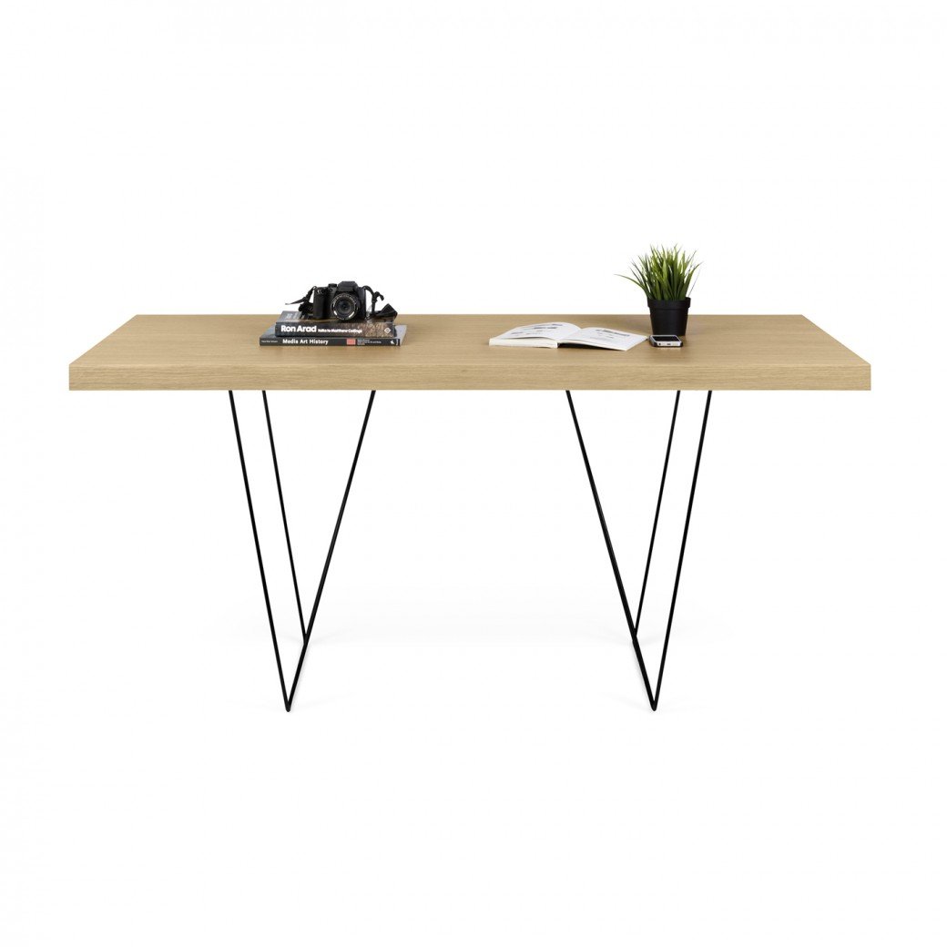 • Mesa com tampo em madeira clara e base metálica preta