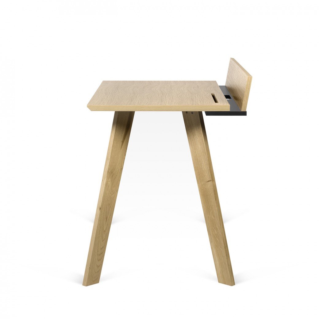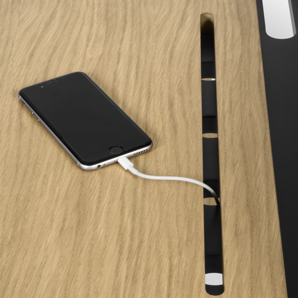 A secretária Loft reúne diferentes áreas para a disposição de tablets, telemóveis e cadernos. O elemento lacado a preto inclui uma zona central aberta para a passagem de cabos, o que contribui para uma área de trabalho mais livre de fios.