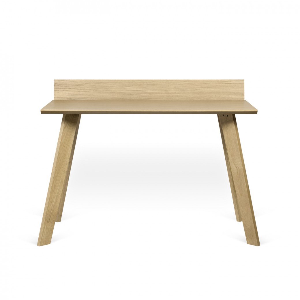 Mesa de madeira clara com quatro pés inclinados